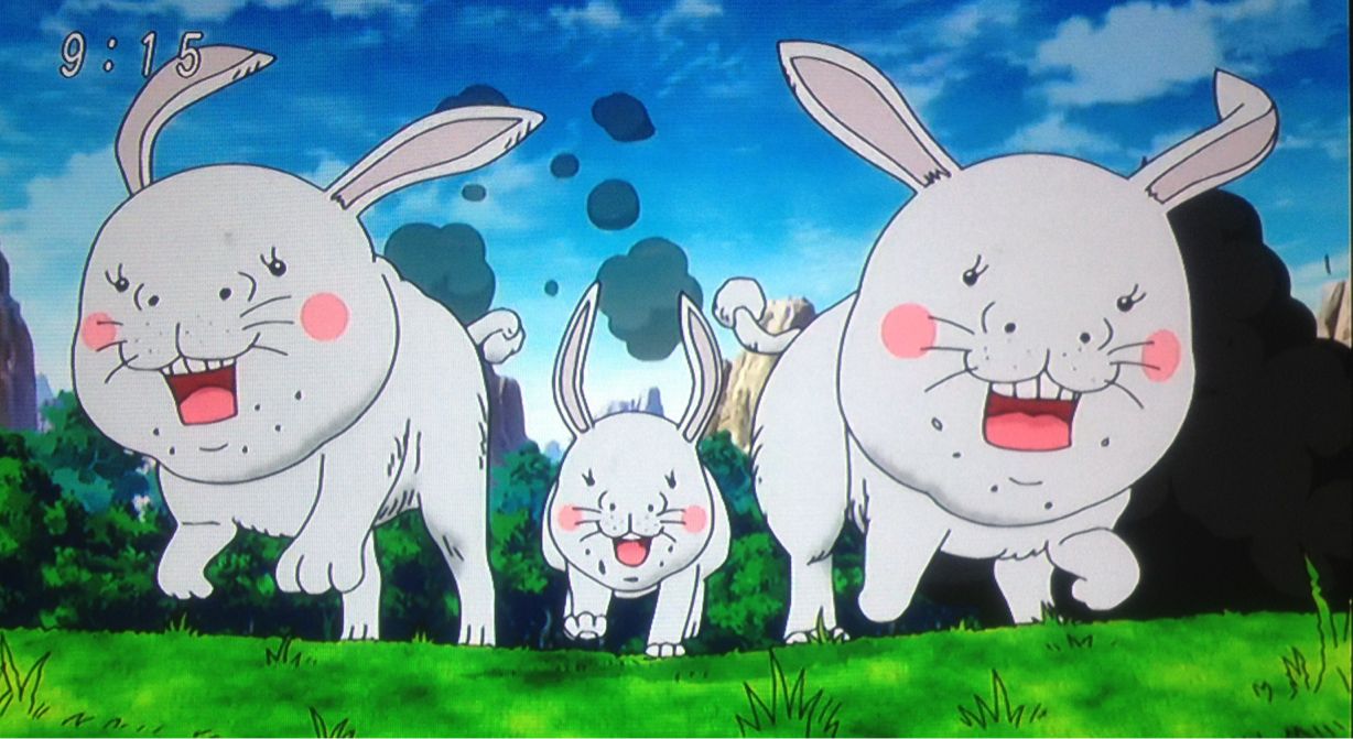 おにぎりのご飯粒を口のまわりに付けて逃げるノラウサギ達。