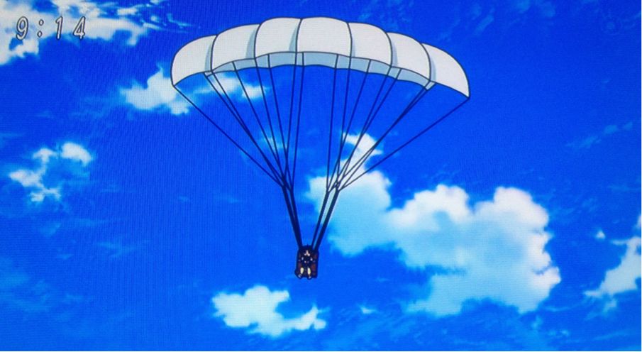 パラシュートが開いて、降りたった先にちょうどトリコさん登場。