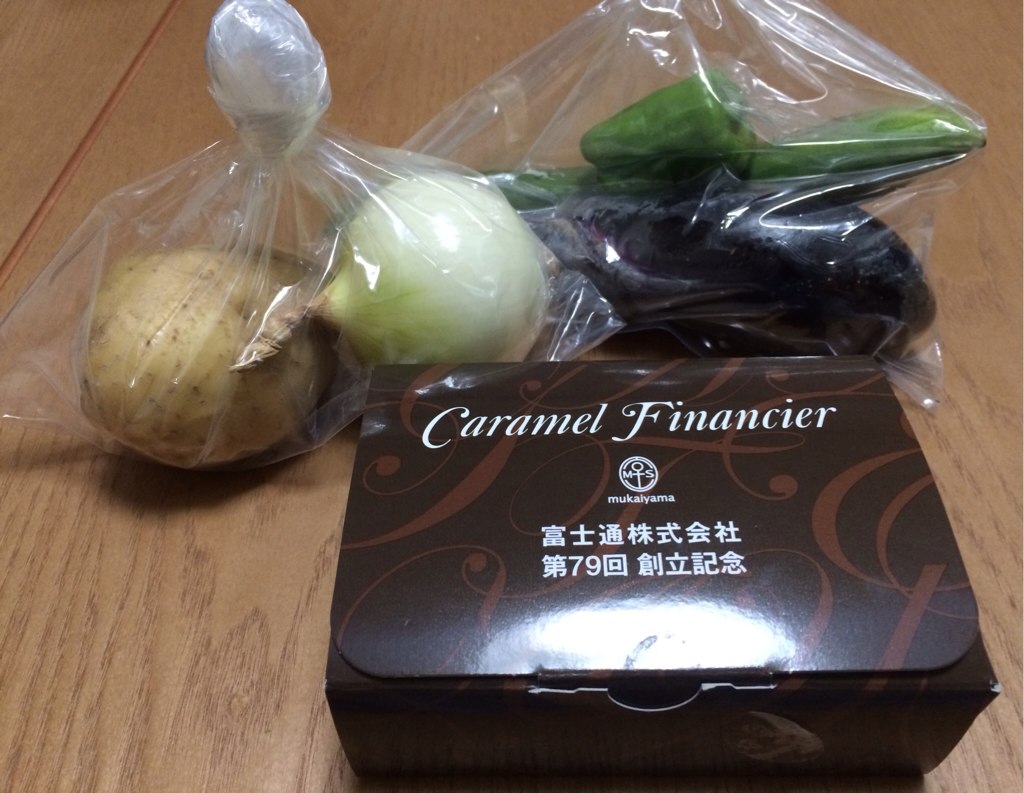 家で採れた野菜(じゃがいも、たまねぎ、なす、ピーマン、きゅうり)と、げろちゃんの仕事関係でいただいたお菓子。