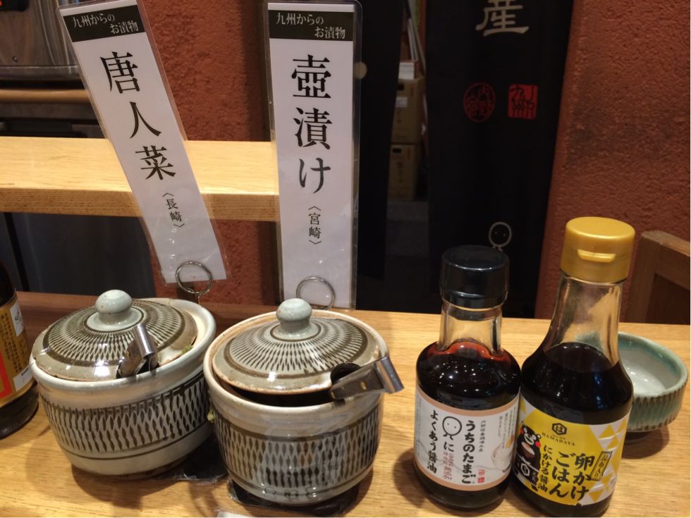 テーブルに、いろんなお醤油(卵かけご飯専用)や、お漬物が置かれています。