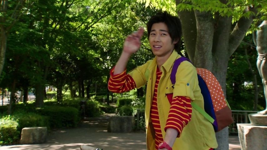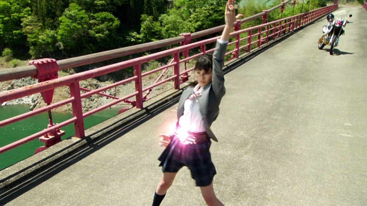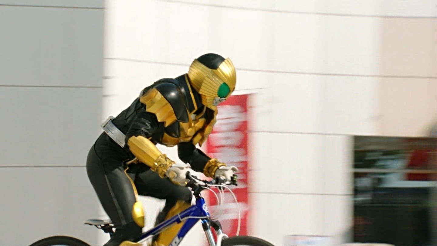 仮面ライダーが、チャリこいでるという珍しい絵。