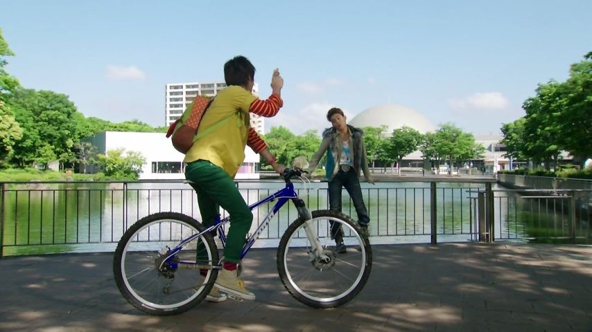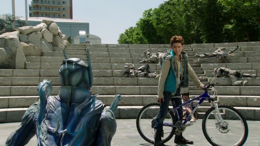 自転車で敵を倒す仁藤。