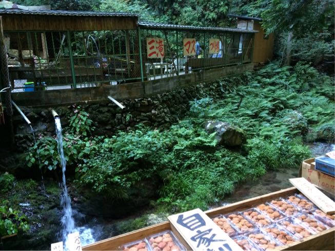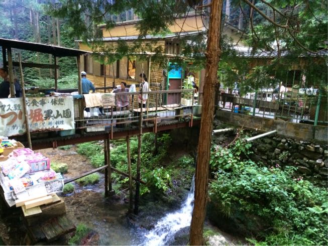 滝を拝んでから、山を下っていき、川の上?向こう側にある釣り堀へ!