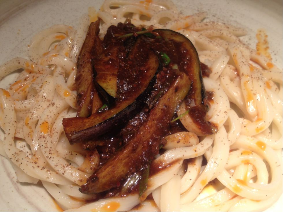 四川麻婆茄子うどん。