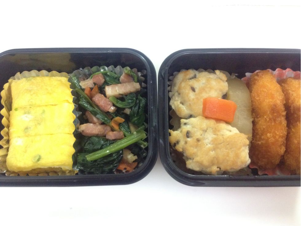 右の容器内左側は、キューピー3分クッキングで紹介されていたお料理をちょっとアレンジした、お豆腐&しいたけを入れた鶏つくねと大根の煮もの。