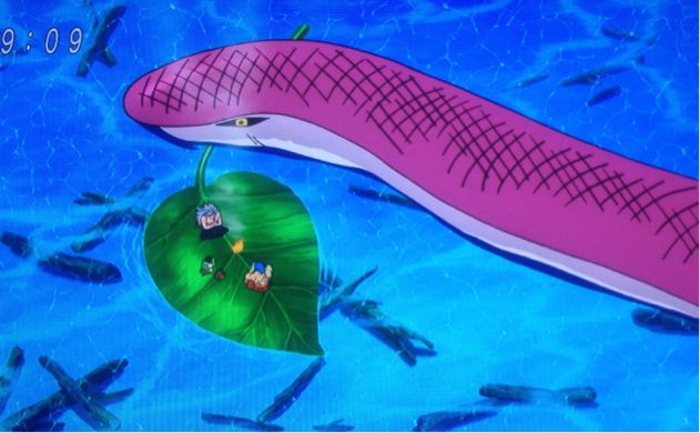 クイン(マザースネーク)のくわえた葉っぱの上で、白雪鮎を食べる3人。