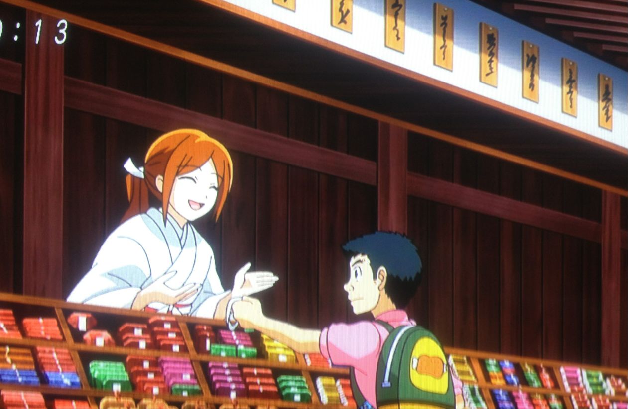 おみくじで『凶作』が出たので、御守りを買う小松。