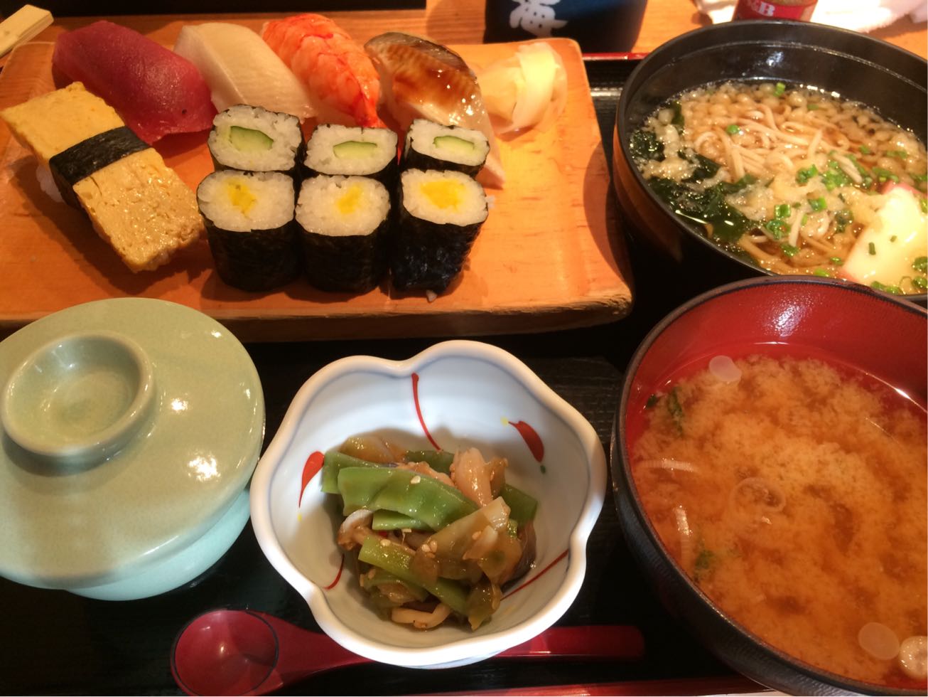 お蕎麦とお寿司とお味噌汁、茶碗蒸し。