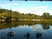日本庭園の中にある、池のほとりの東屋から。