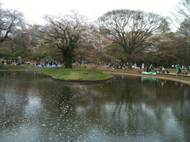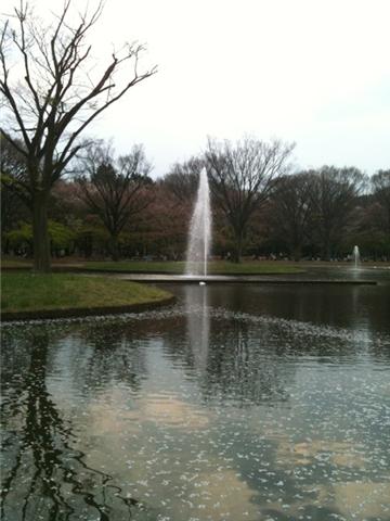 でも、よく見ると池に花びらがたくさん浮かんでいます。
