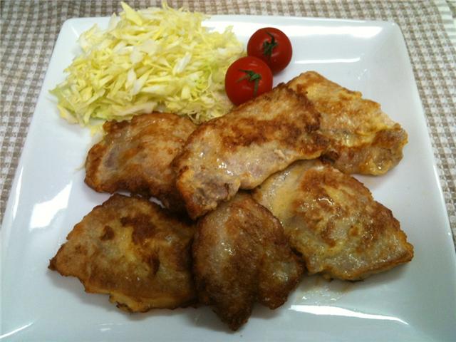 豚肉に塩コショウをふって、暫らくおいた後、両面に小麦粉をまぶします。
