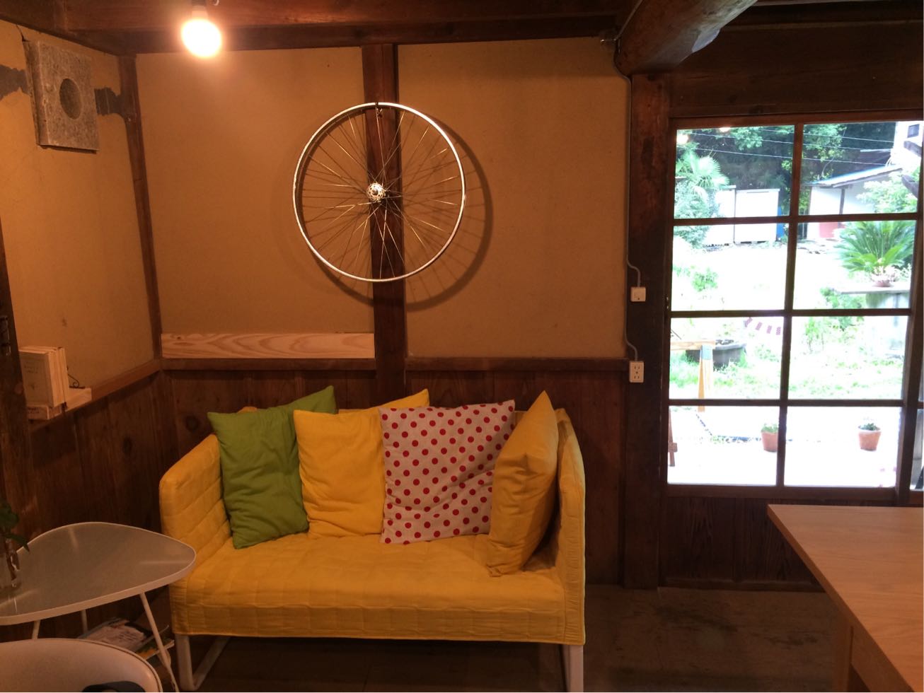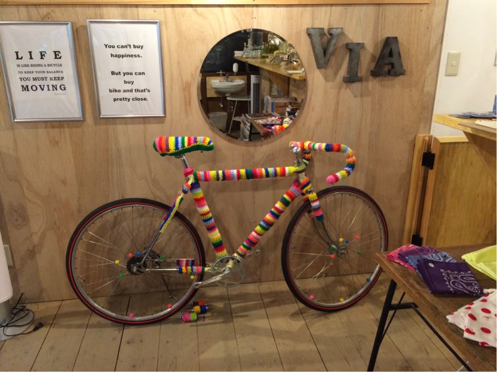 中に入ると、カラフルな毛糸に巻かれた自転車が置いてあります。