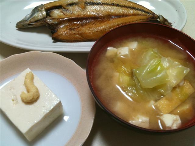 キャベツのお味噌汁と、お豆腐(上の物体はおろししょうが)。