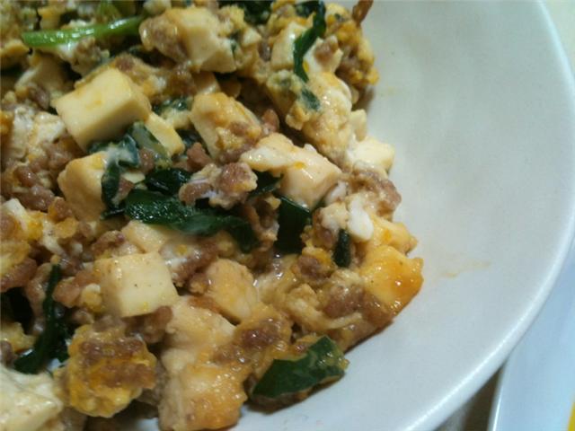 豆腐とひき肉とニラとたまごのアレ。夕飯の残り。