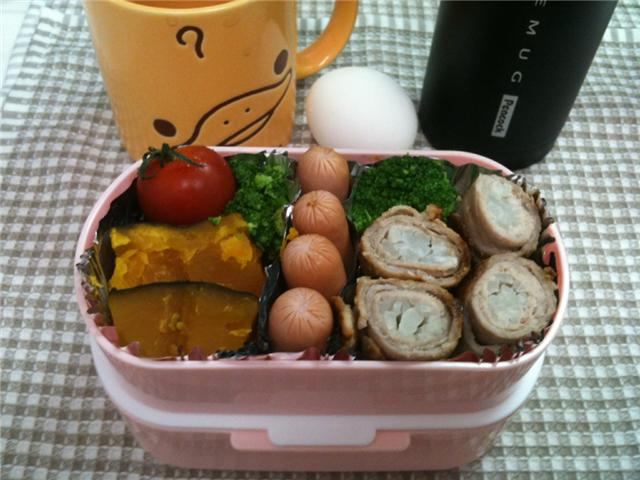 左からミニトマト、ブロッコリ、かぼちゃ、ウインナさん、肉巻きだいこん。
