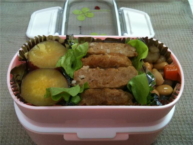 左がサツマイモ、真ん中ブーケレタスとミニハンバーグ(冷凍食品)、右、やさいと豆。