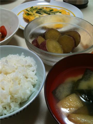 ニラたま、さつまいも、わかめとネギのお味噌汁、納豆。