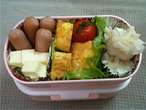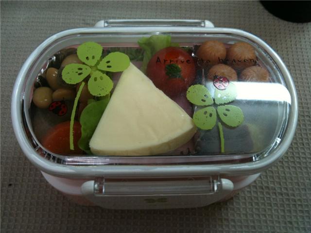 左がやさいと豆、だいこんの煮物(残り物)、真ん中チーズの下には、かまぼこ、レタス。ミニトマト。