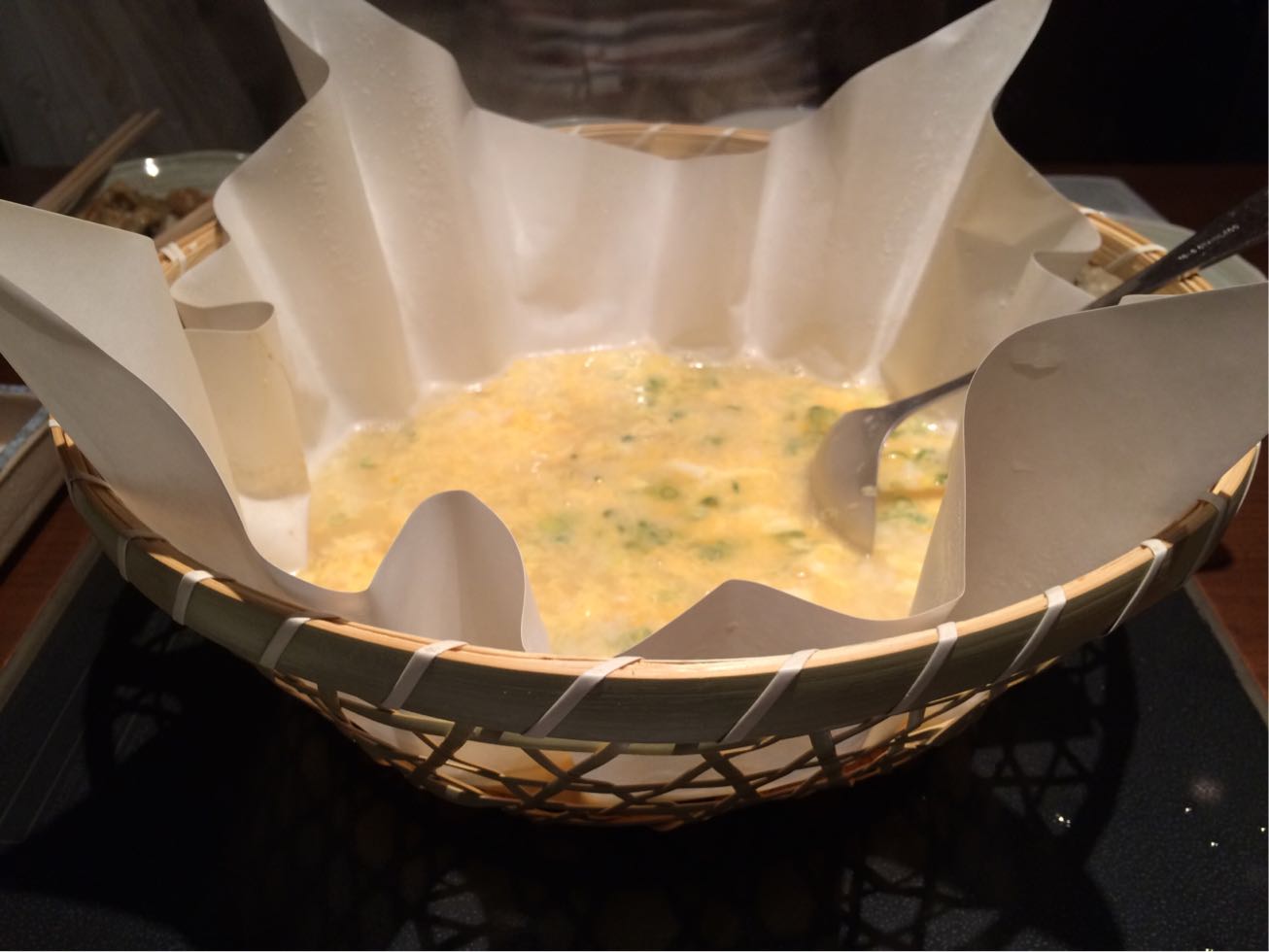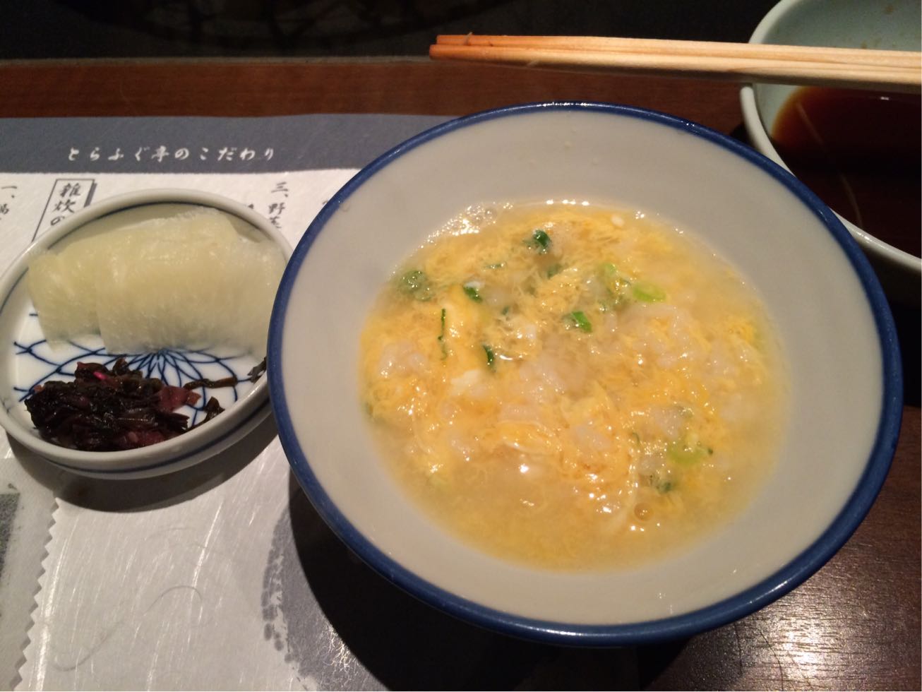 てっちりの食後は、鍋の出汁をつかった雑炊、たまごは半熟状態です。