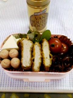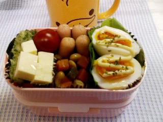 磯辺揚げ(冷凍食品)、ミニトマト、チーズ、ソーセージ、やさいと豆、半熟卵に塩・マヨ&ドライパセリのせ。