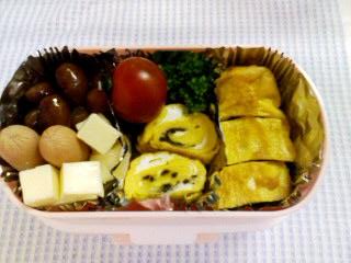 金時豆、ウインナ、チーズ、トマト、ブロッコリ、塩昆布入り卵焼き。