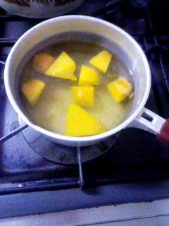 ① かぼちゃは皮をむいて、お鍋でゆで煮します。5分くらいかな。