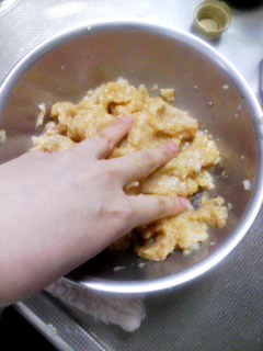 ③ ボウルに鶏ひき肉、しょうゆ大さじ1/2杯、酒小さじ1杯、卵、②のタマネギ、ショウガ汁を入れ、粘りがでるまで混ぜる。
