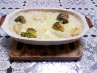 ③ 耐熱皿にバターを塗り、②を入れ、ブロッコリーをのせてピザ用チーズを散らす