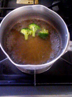 ① ブロッコリーはちいさめの小房に分け、コンソメスープでしっかりゆでる。…今は2分くらい?
