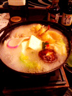 一人分サイズの鍋に、カニやホタテ、シャケなどが入った塩味ベースの鍋でした。