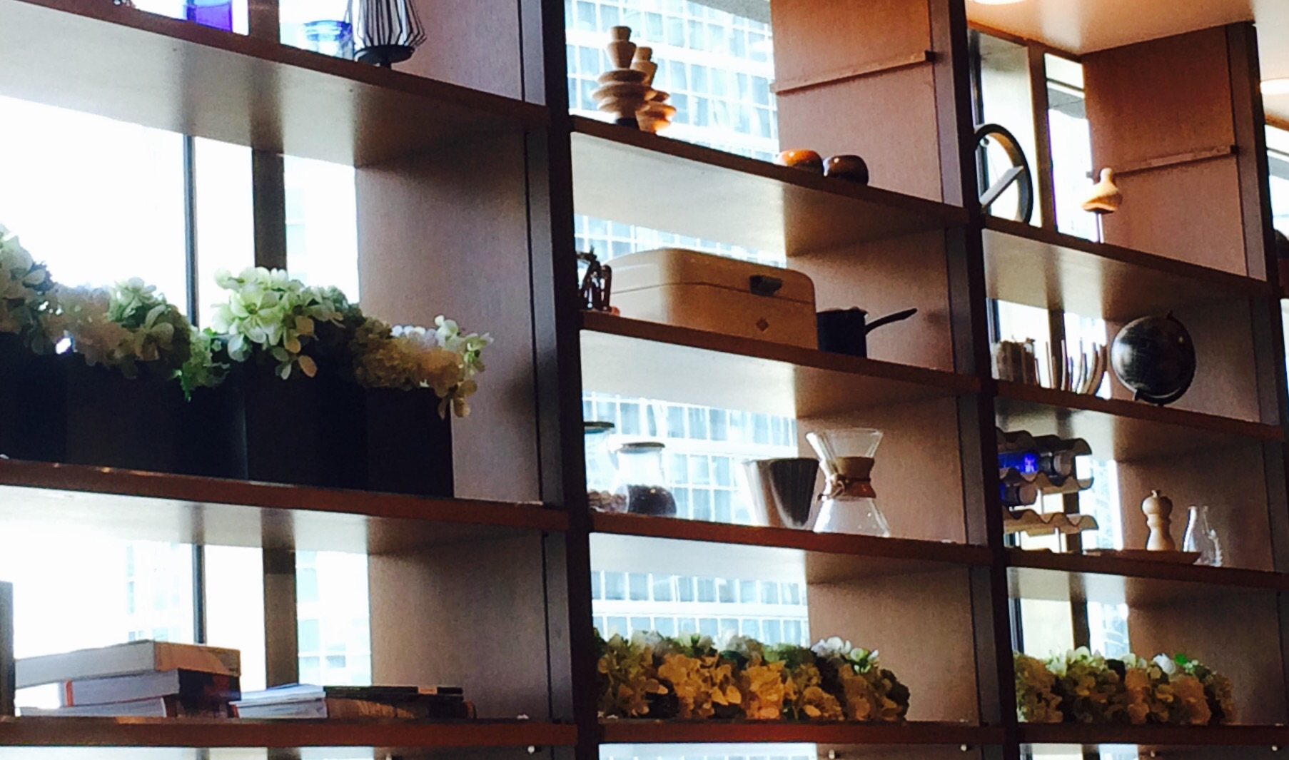 窓の向こう側に、品川の高層ビル群が見えますね。