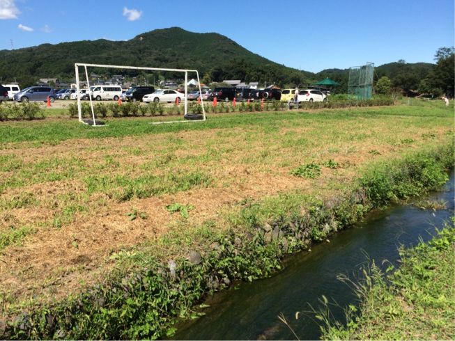 巾着田のグラウンド(駐車場)と日和田山(305m)、手前に小川。